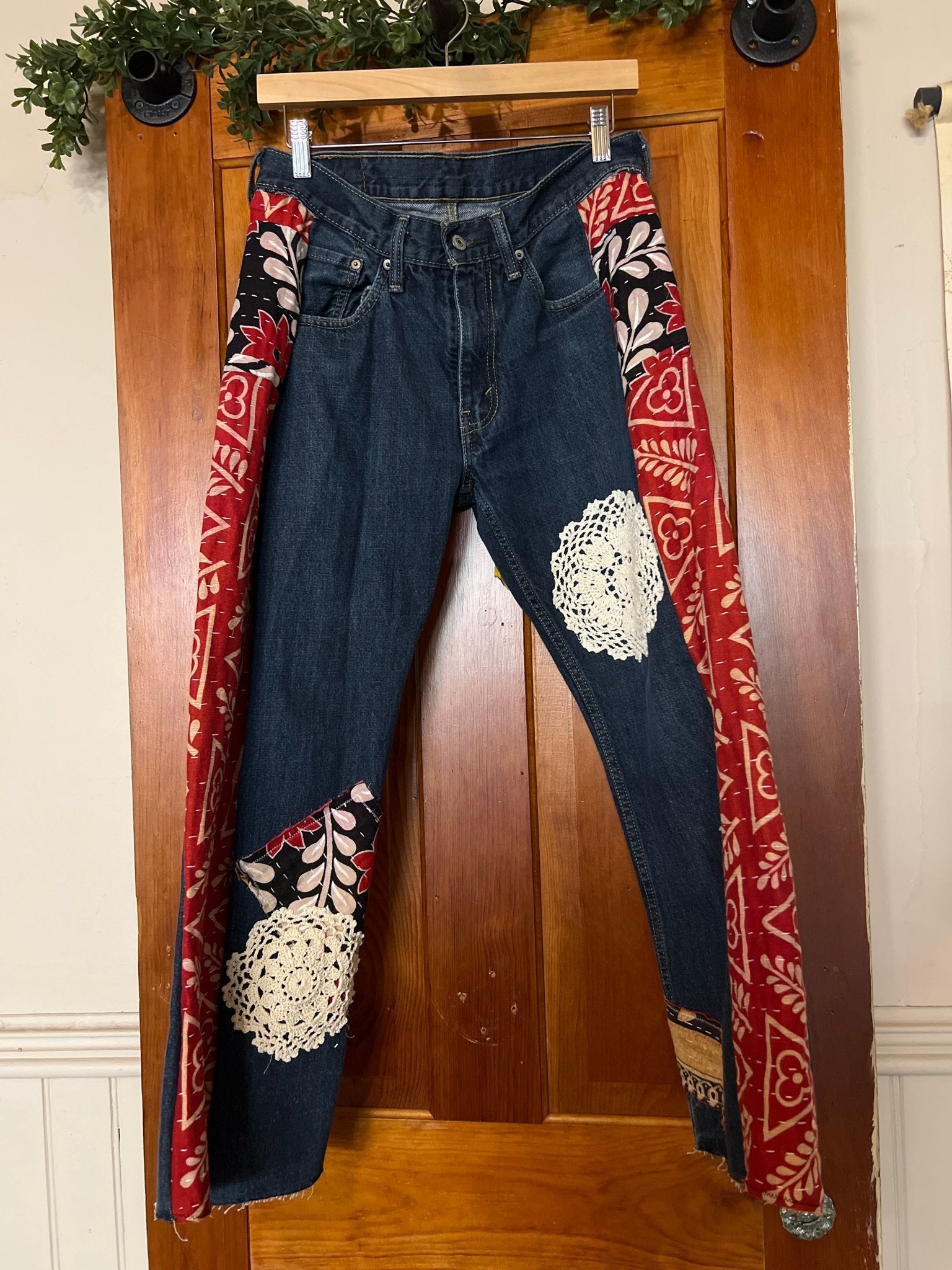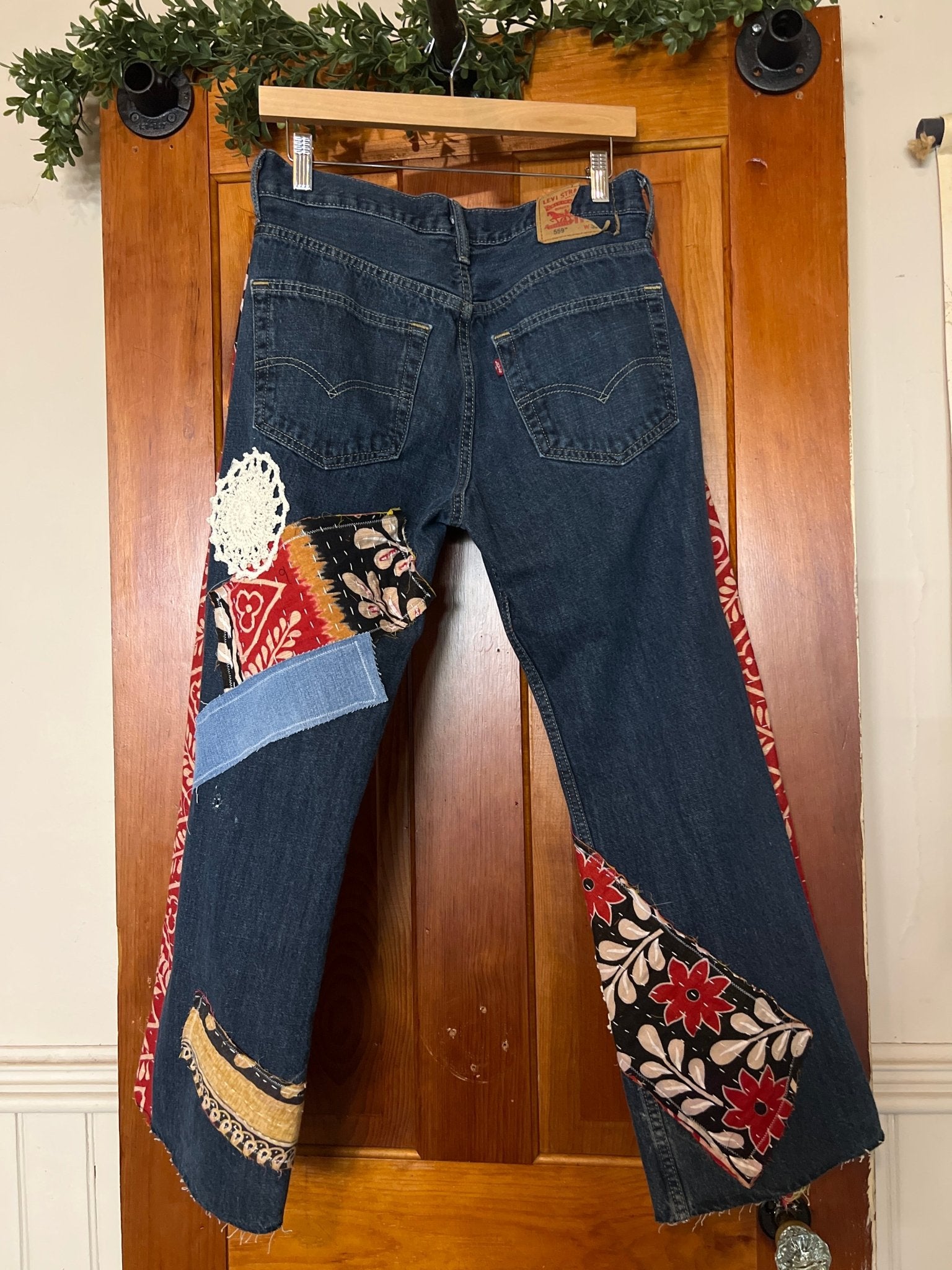 These stinkin' CUTE upcycled zip fly levi's jeans began with a waist 31".... When upcycled several inches of Kantha Fabric panels were added to each side.