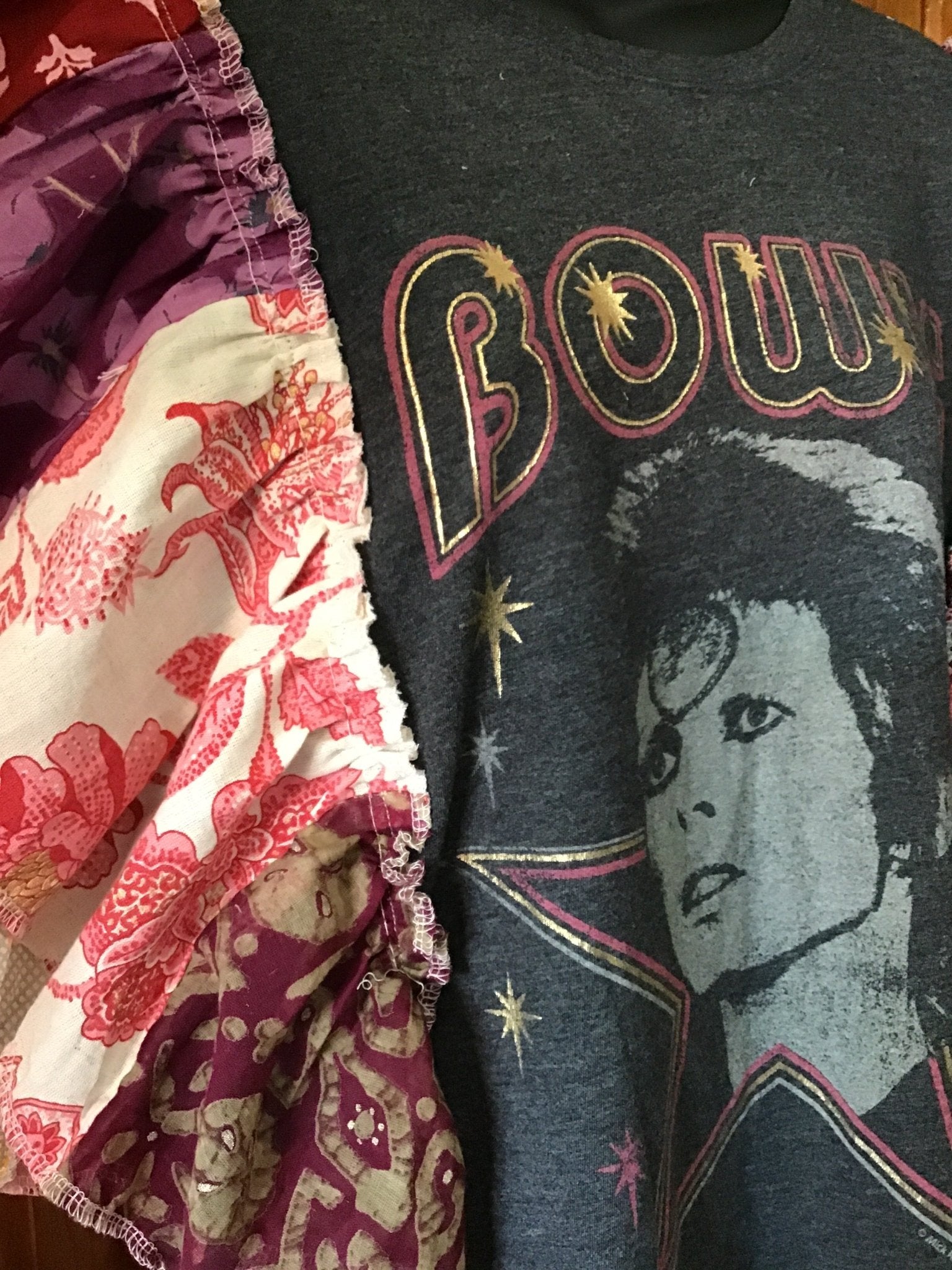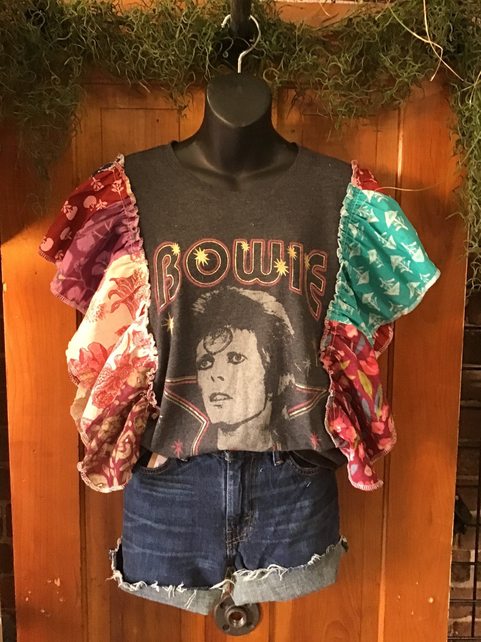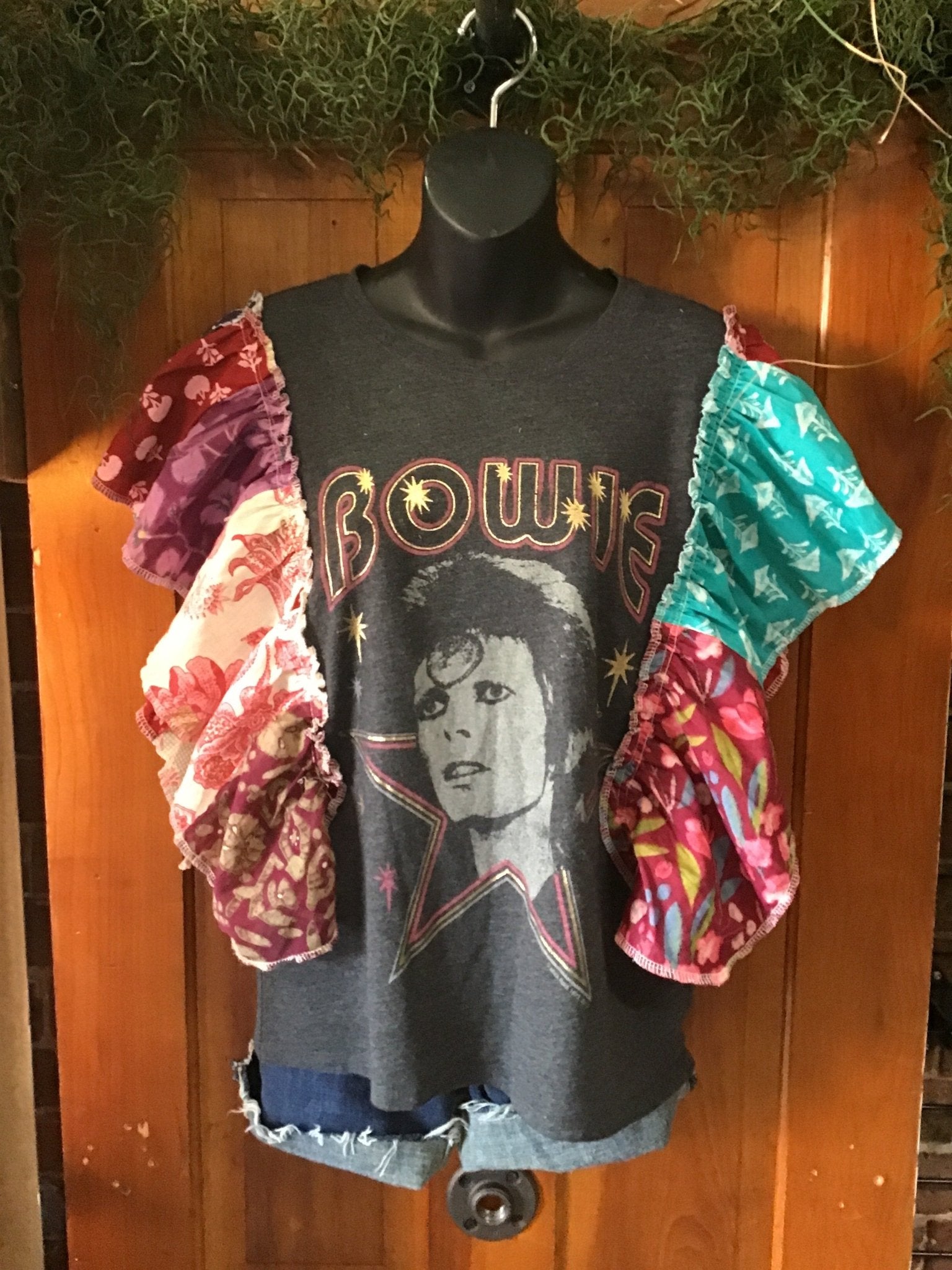 This Bowie graphic tee will surely make you smile ... The sounds of of the David Bowie pair well with jeans or cutoffs for your next music festival or concert! This eco-friendly, sustainable statement piece is created from upcycled patchwork -this unique band tee is one of a kind! There is a size on the tee that says medium but definitely check the measurements!!! The tshirt sleeves were cut off (raw edge) and the patchwork edges have been serger finished. We recommend you compare your best-fitting t-shirt measurements with the measurements below: