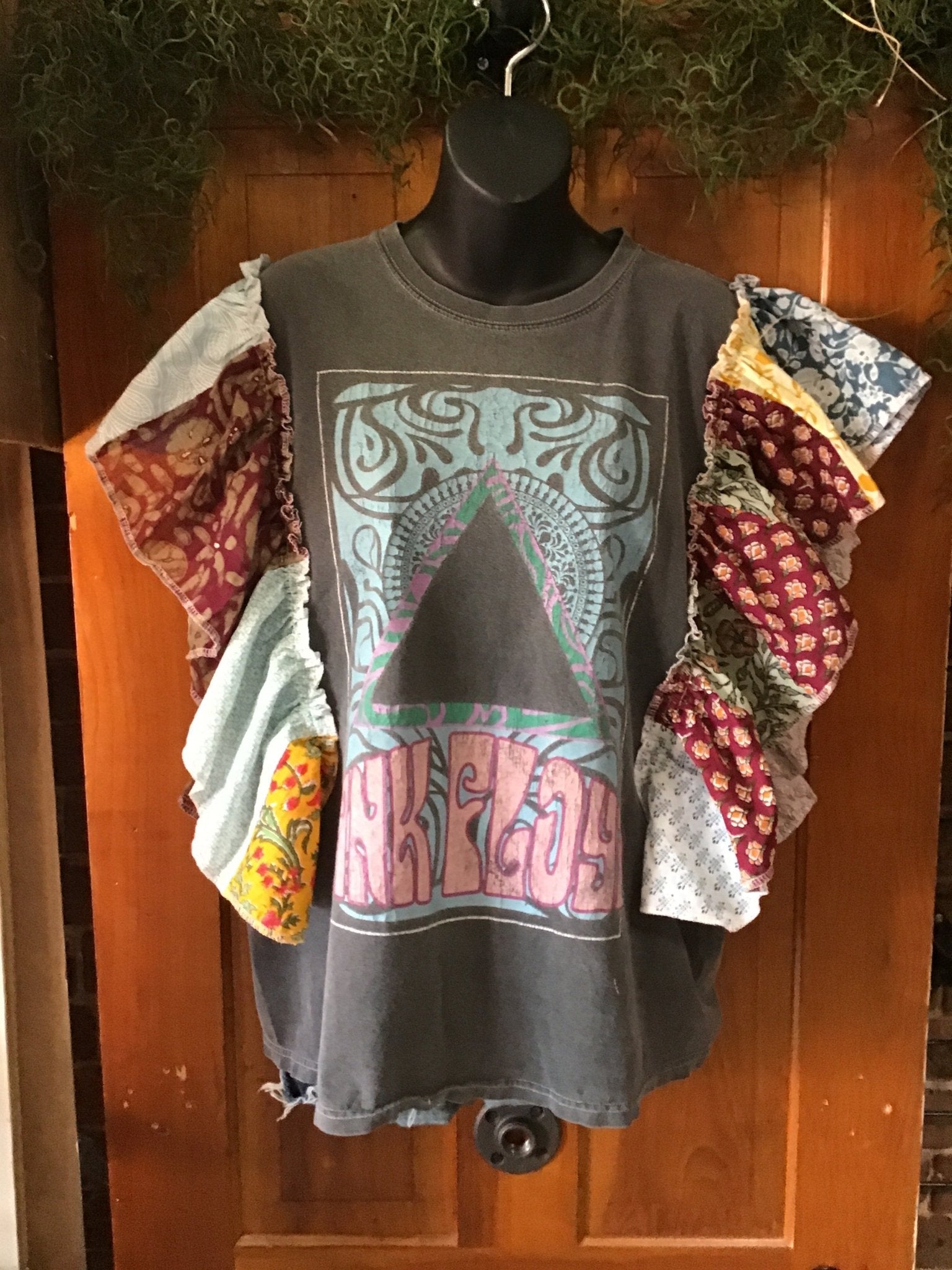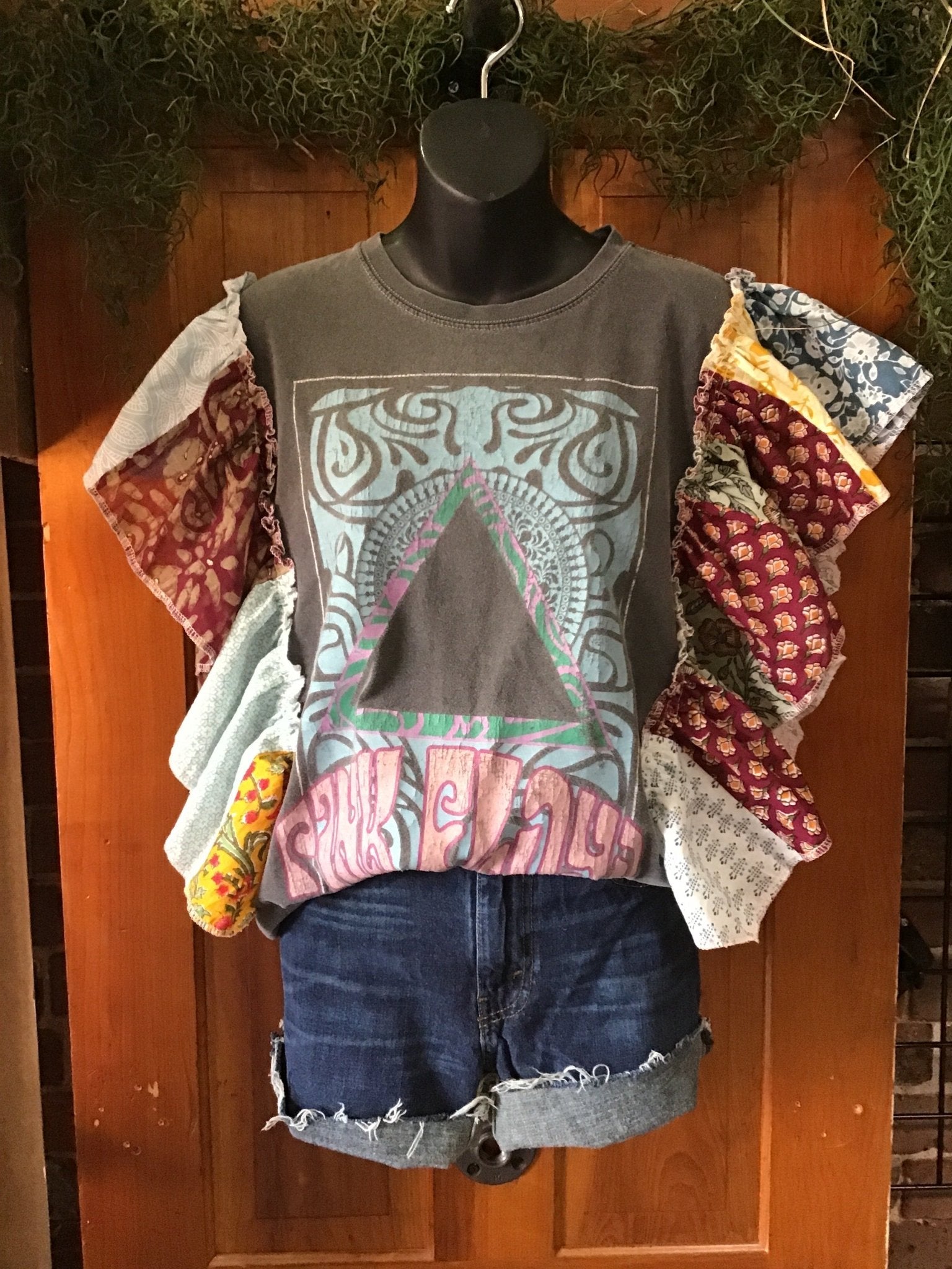 This gray Pink Floyd graphic tee will surely make you smile ... The sounds of of the Pink Floyd pair well with jeans or cutoffs for your next music festival or concert! This eco-friendly, sustainable statement piece is created from upcycled patchwork -this unique band tee is one of a kind! There is a size on the tee that says medium but definitely check the measurements!!! The tshirt sleeves were cut off (raw edge) and the patchwork edges have been serger finished. We recommend you compare your best-fitting t-shirt measurements with the measurements below: