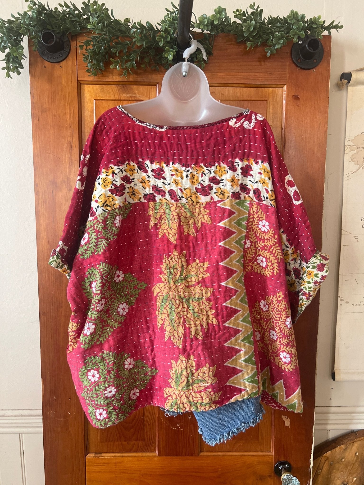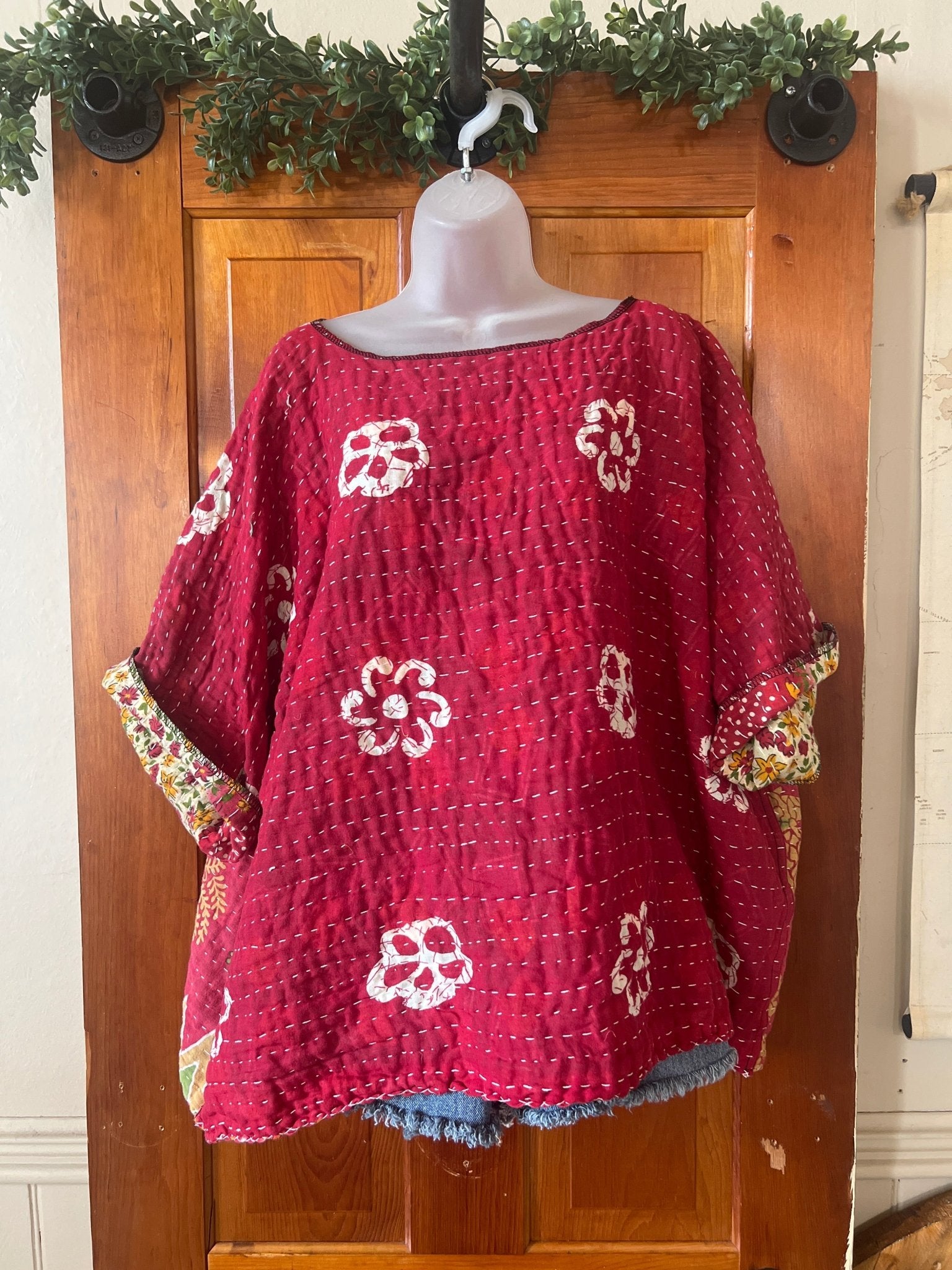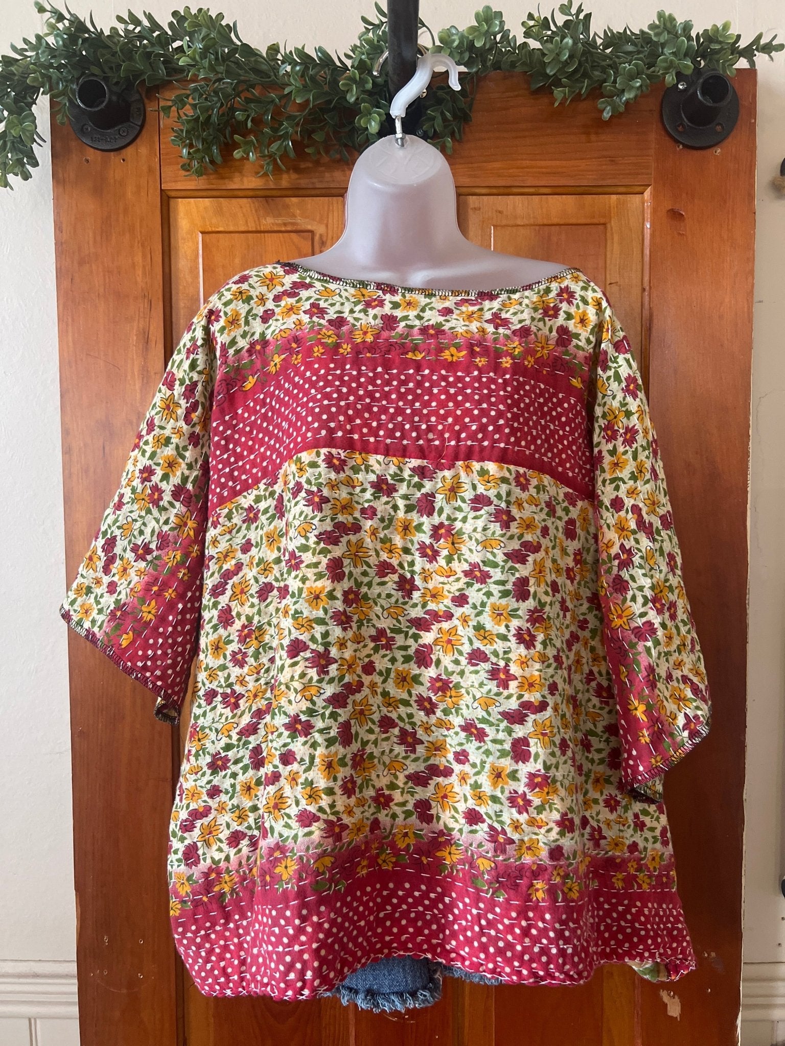 Get ready to LOVE this reversible kantha top-it's like TWO TOPS IN ONE!!! Perfect for pairing with cutoffs, jeans, linen pants and so many other possibilities-great for travel too-as it can be worn two entirely different ways! This eco-chic, planet-loving gem is crafted from upcycled Kantha quilts—talk about a one-of-a-kind treasure! The tag? There is no tag but we call it a free size (S-2X) but check the measurements!!! Just a friendly tip: peek at your fave oversized top measurements and compare them with the ones below!