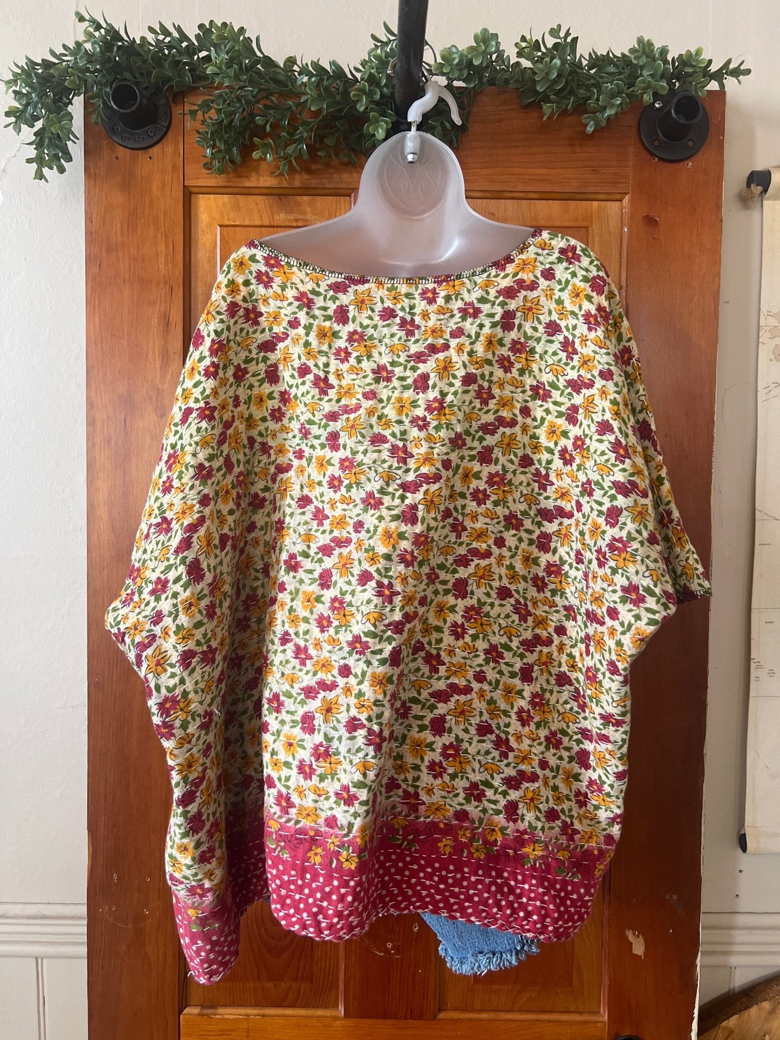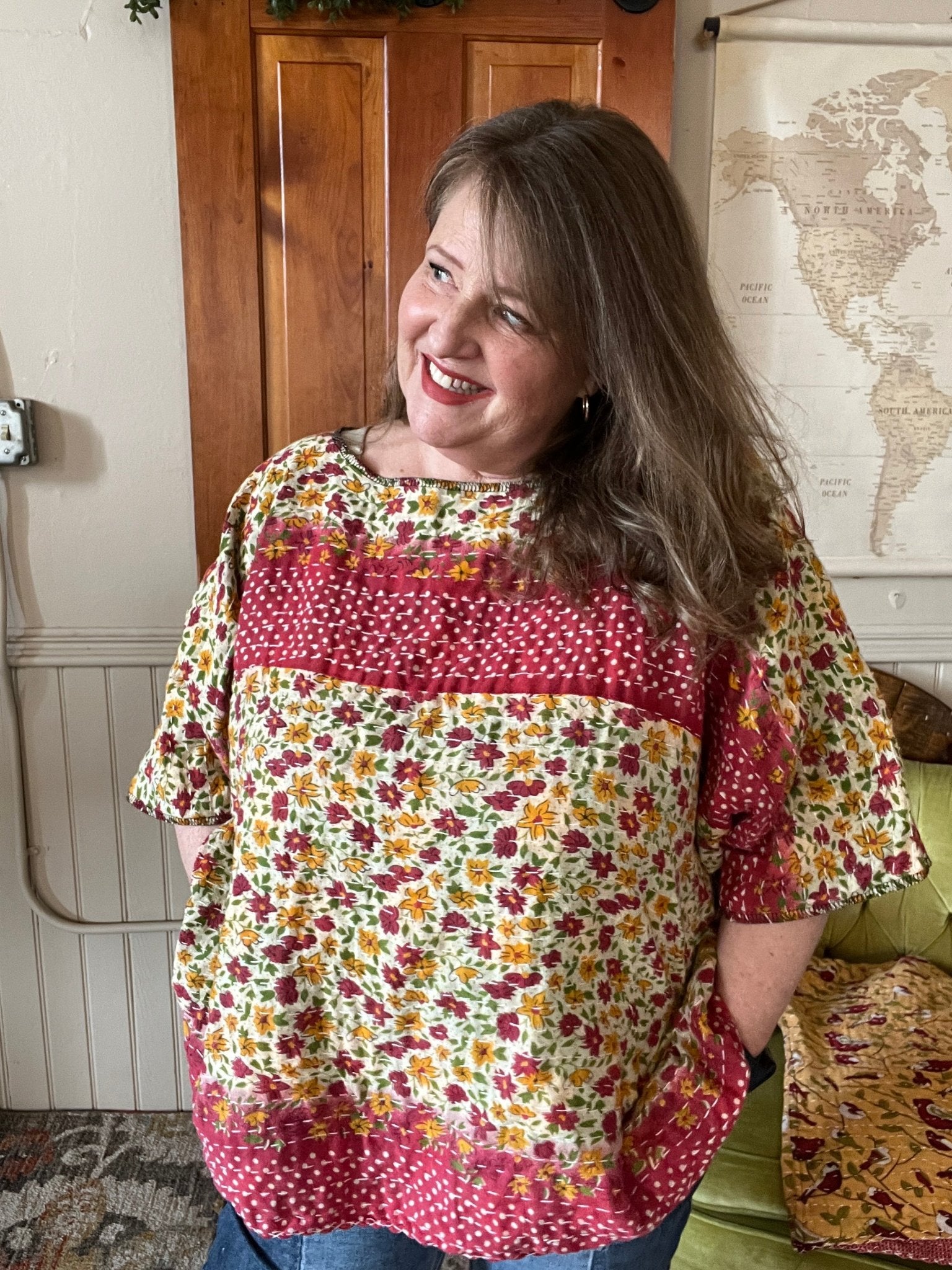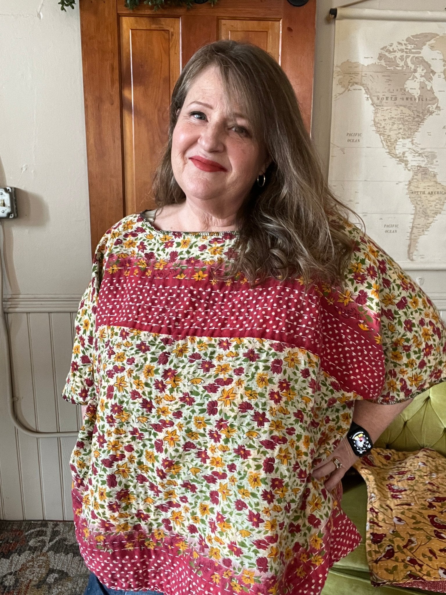 Get ready to LOVE this reversible kantha top-it's like TWO TOPS IN ONE!!! Perfect for pairing with cutoffs, jeans, linen pants and so many other possibilities-great for travel too-as it can be worn two entirely different ways! This eco-chic, planet-loving gem is crafted from upcycled Kantha quilts—talk about a one-of-a-kind treasure! The tag? There is no tag but we call it a free size (S-2X) but check the measurements!!! Just a friendly tip: peek at your fave oversized top measurements and compare them with the ones below!