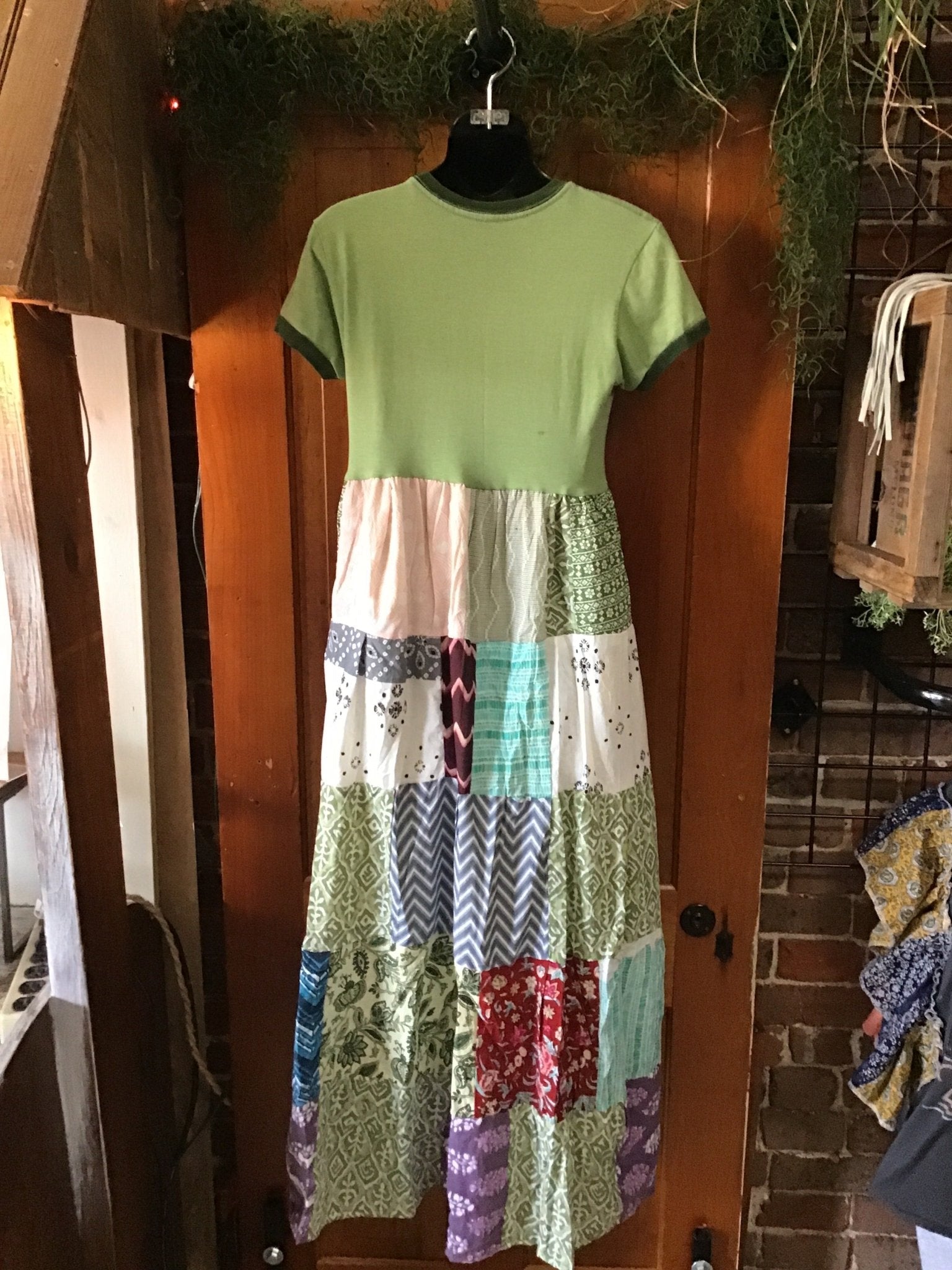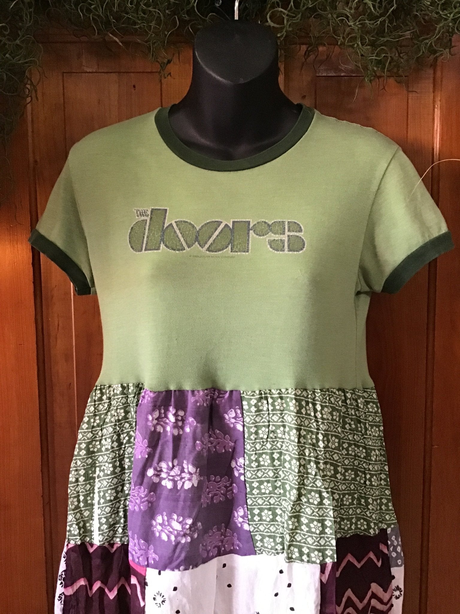 Upgrade your wardrobe with this one-of-a-kind, upcycled The Doors t-shirt, now transformed into a an eco-friendly patchwork dress for concerts or everyday wear. Versatility at its finest, letting you express your unique style... Patchwork pieces are all cotton. There is a cotton gauze slip that extends past the midpoint of the patchwork and a patch on the green patchwork in front... T-shirt is cotton or cotton blend. There is no size on this dress though it seems to be a smaller size- check measurements!